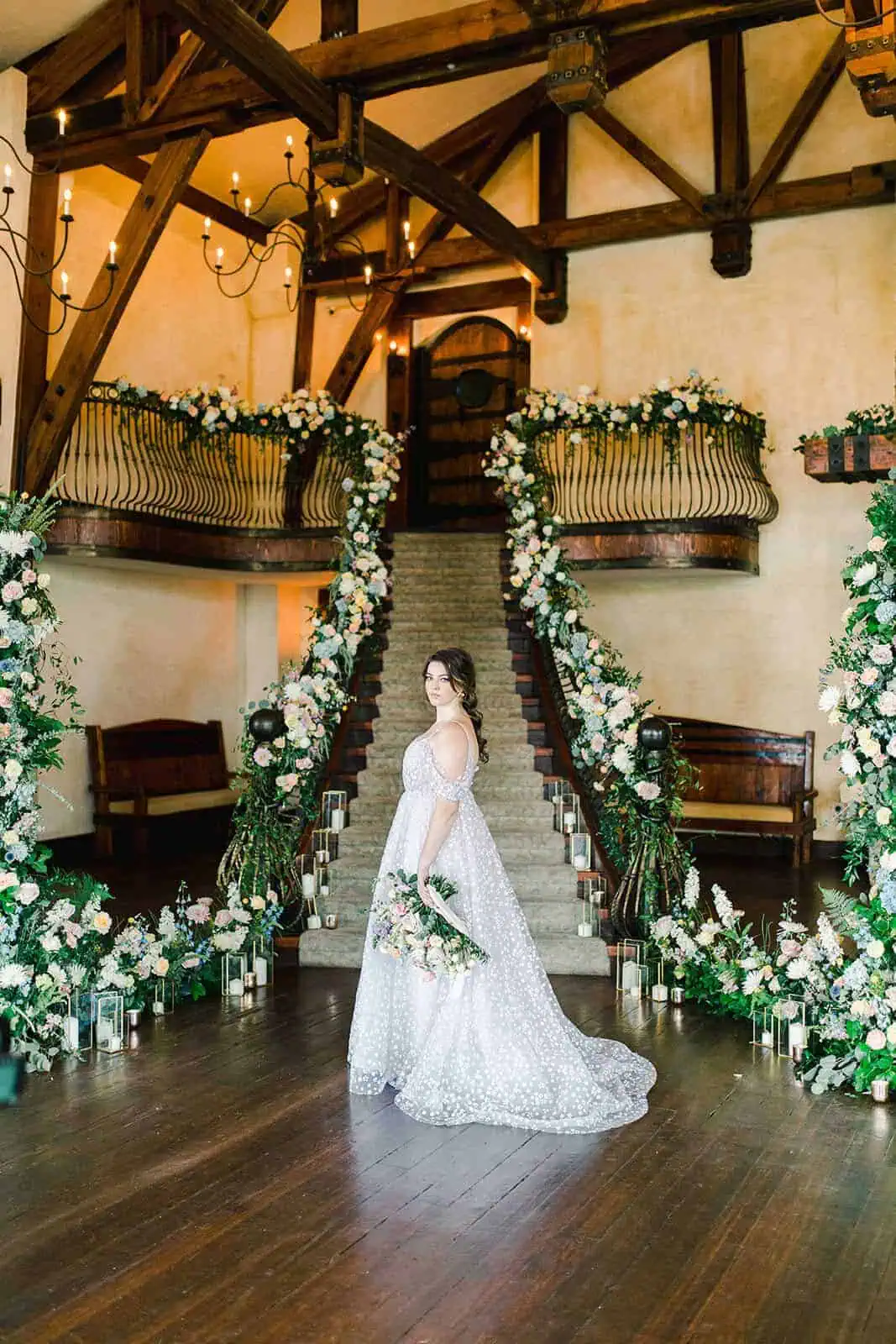 The inside space of the castle at Wadley is often referred to as the great hall. Within the great hall, you will find over 4500 square feet to plan your wedding reception. Additionally, the space offers two gorgeous staircases leading up to a balcony landing. Both of which are perfect for making a grand entrance whether heading to your ceremony or reception. Conversely, many couples opt to access this space before their guests take their seats in order to capture wedding photos against the backdrop of the great hall. Resting between the two grand staircases, you’ll find a 38-foot-tall stone fireplace. The fireplace serves as a major focal point of the great hall, made all the more stunning by the addition of luxurious floral design.